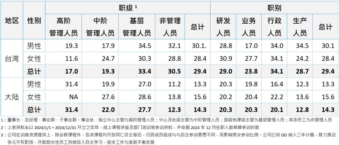 台湾厂区除未满试用期、留职停薪及定期契约员工外,其余员工皆需参与;大陆厂区除未满试用期、长期工伤、短期实习生、留职停薪员工外,其余员工皆需参与,且公司以绩效为导向,不会因为性别而有差别待遇。