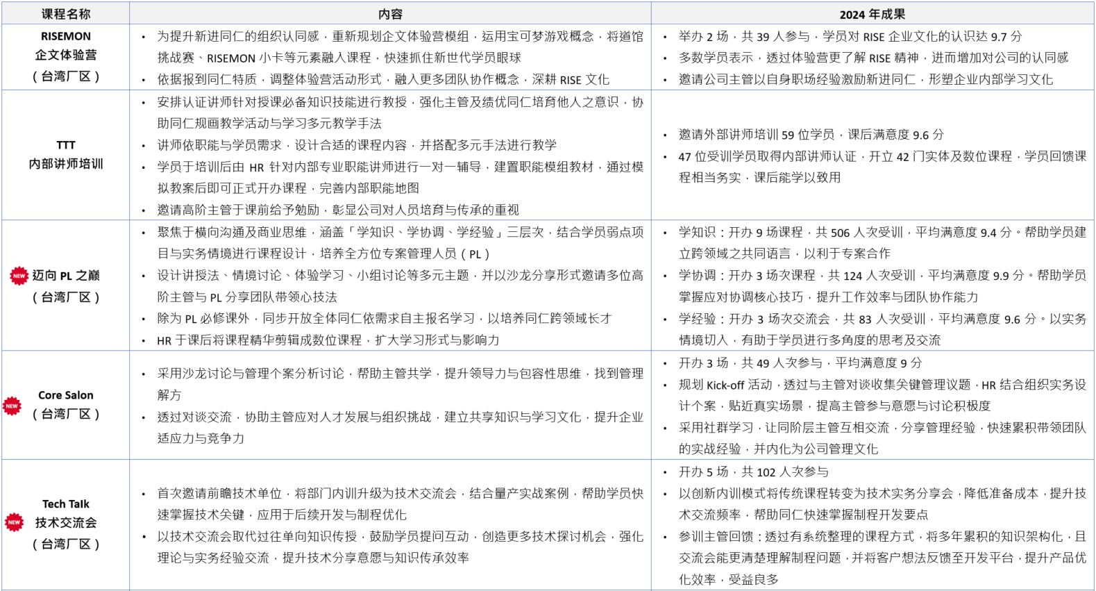 - 举办「We RISE! Camp企文共识营」,透过团队建立活动让实习生更认识公司RISE文化,平均满意度4.8分(满分5分)