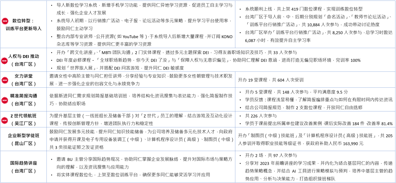- 合作方式:透过多元管道与「元智大学企业书院」、「臺湾师范大学」、「新竹县政府数位跨域青年职场计画」合作,并邀请员工子女推荐及产学合作同学进行面谈