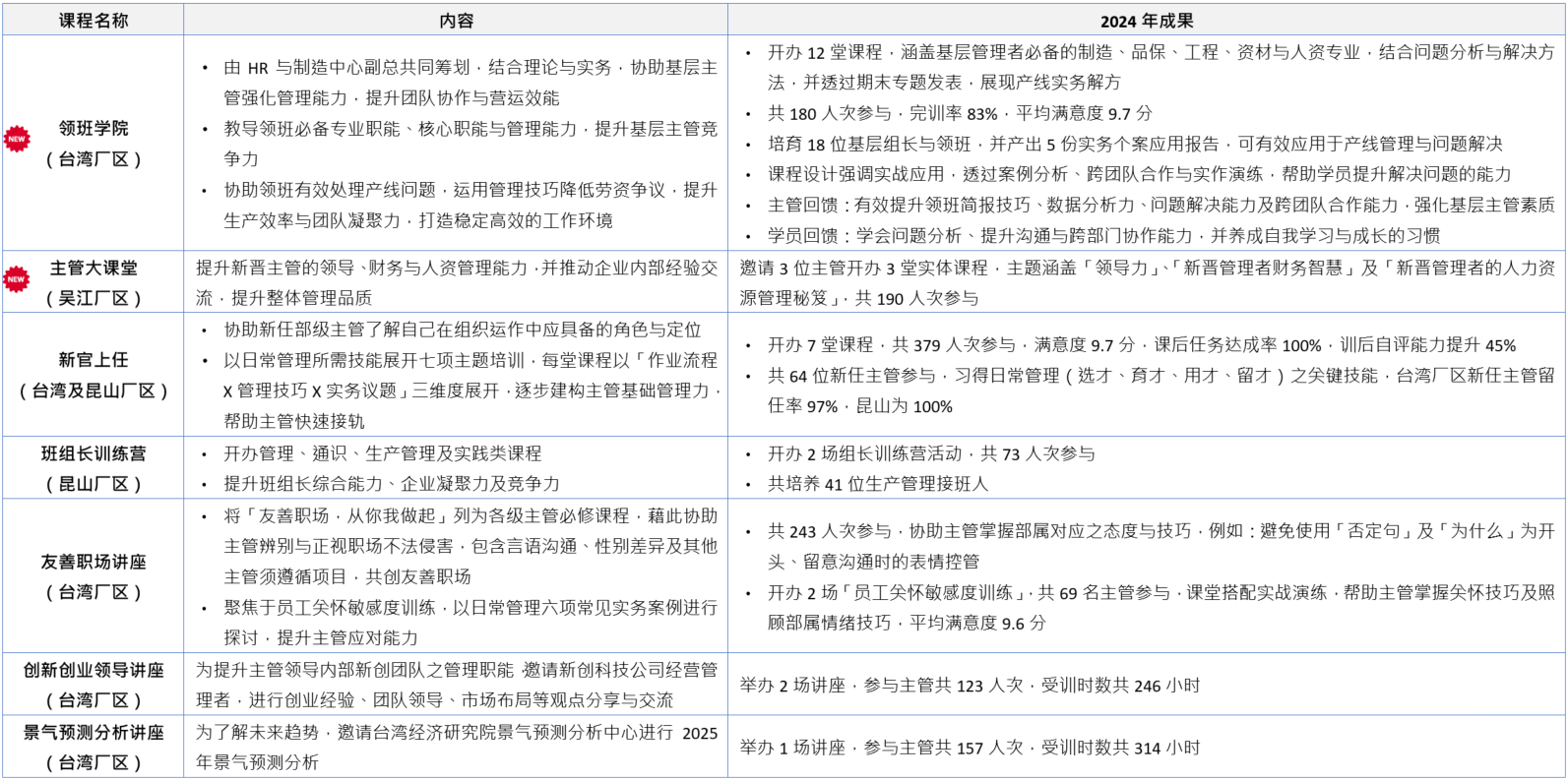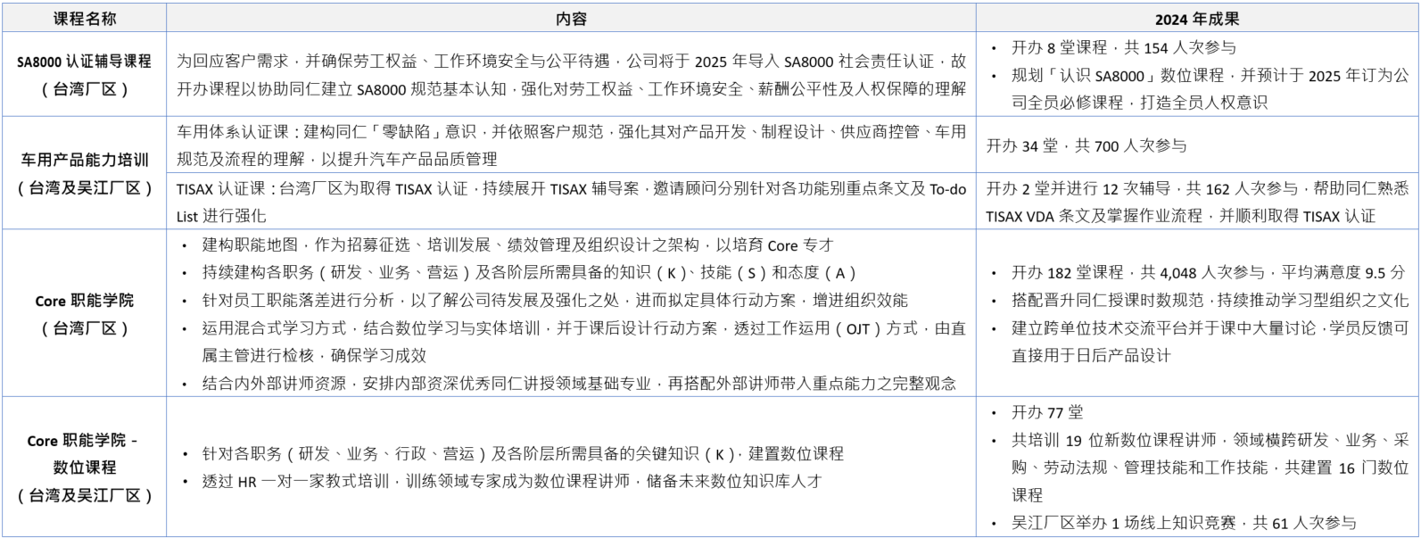 大陆厂区 2024 年总受训人次较 2023 年增加 89%,总受训时数增加 2%,係因多数训练专案採用线上方式,使同仁能同步参加台湾厂区的实体课程;昆山厂区为提升同仁受训意愿,与地方政府合作提供补贴措施,凡参与技能训练后顺利取得相关证照之同仁,即可获得公司提供的证照奖励金,有效提升人员专业与获证率。