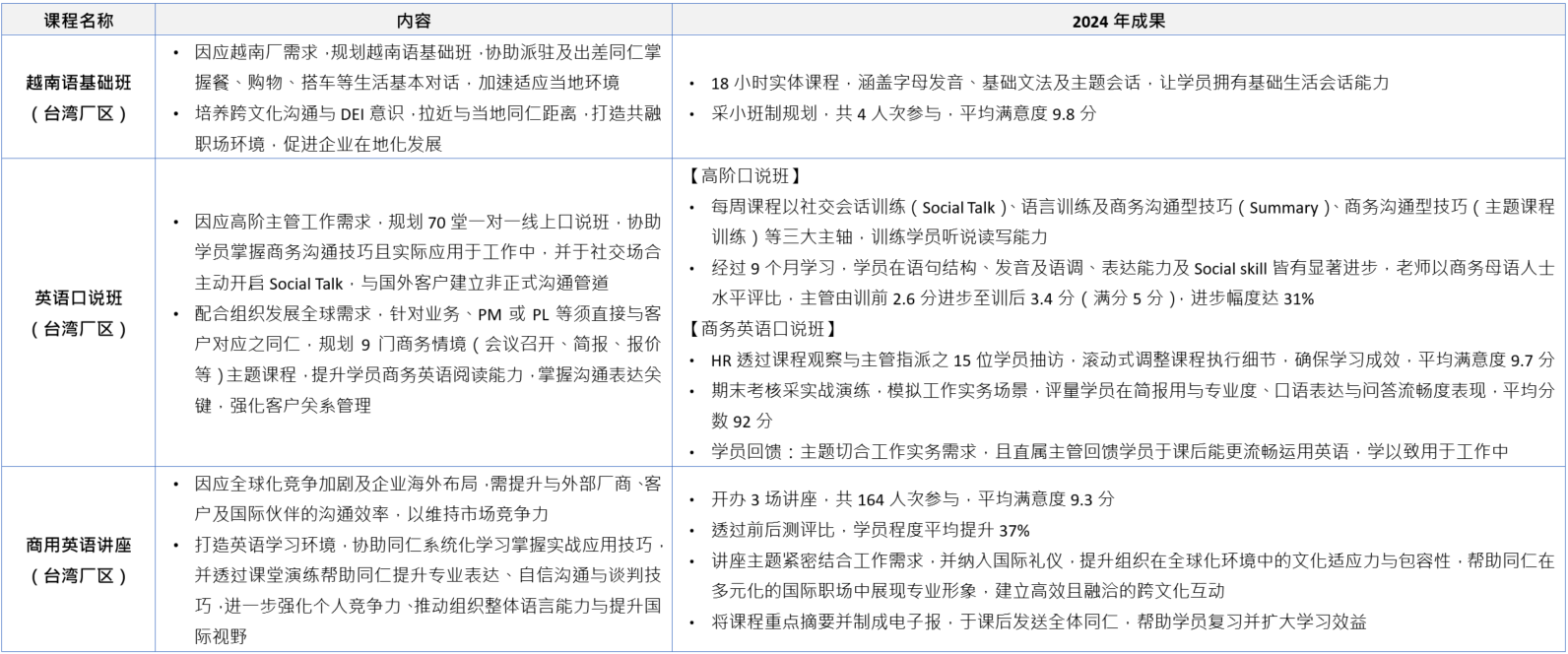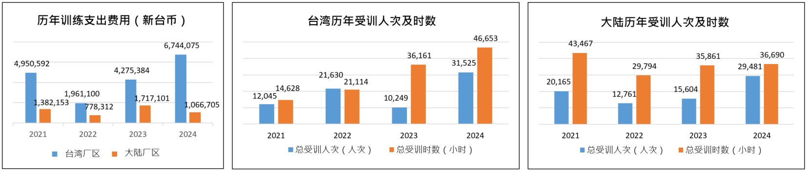 根据历年训练支出费用图表,台湾厂区2024年总训练费用超过新台币674万元,较2023年增加58%,总受训人次增加208%,总受训时数增加29%,係因善用内、外部讲师资源,针对各阶同仁规划系列实体课程,并同步规划线上培训课程,让培训资源扩及至不同厂区,同时搭配交流会与工作指导等多元培育机制,进行专业实务传承。