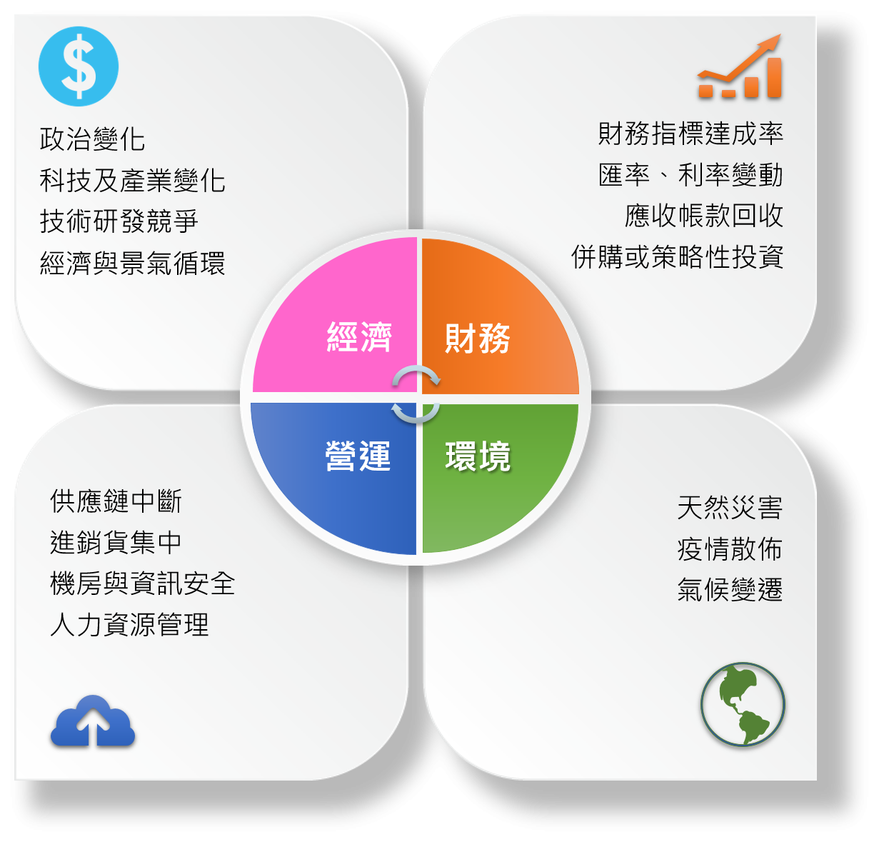 為掌握公司營運可能面臨之內外部風險,我們進行風險因子鑑別,篩選出風險管理範疇,並依據最新內部稽核之發展及準則要求,監測潛在風險並實行預防措施,以強化風險管理,提升危機應變能力,達到風險控管之目標,進而促進股東價值、維持競爭力與奠定企業永續經營之基礎。