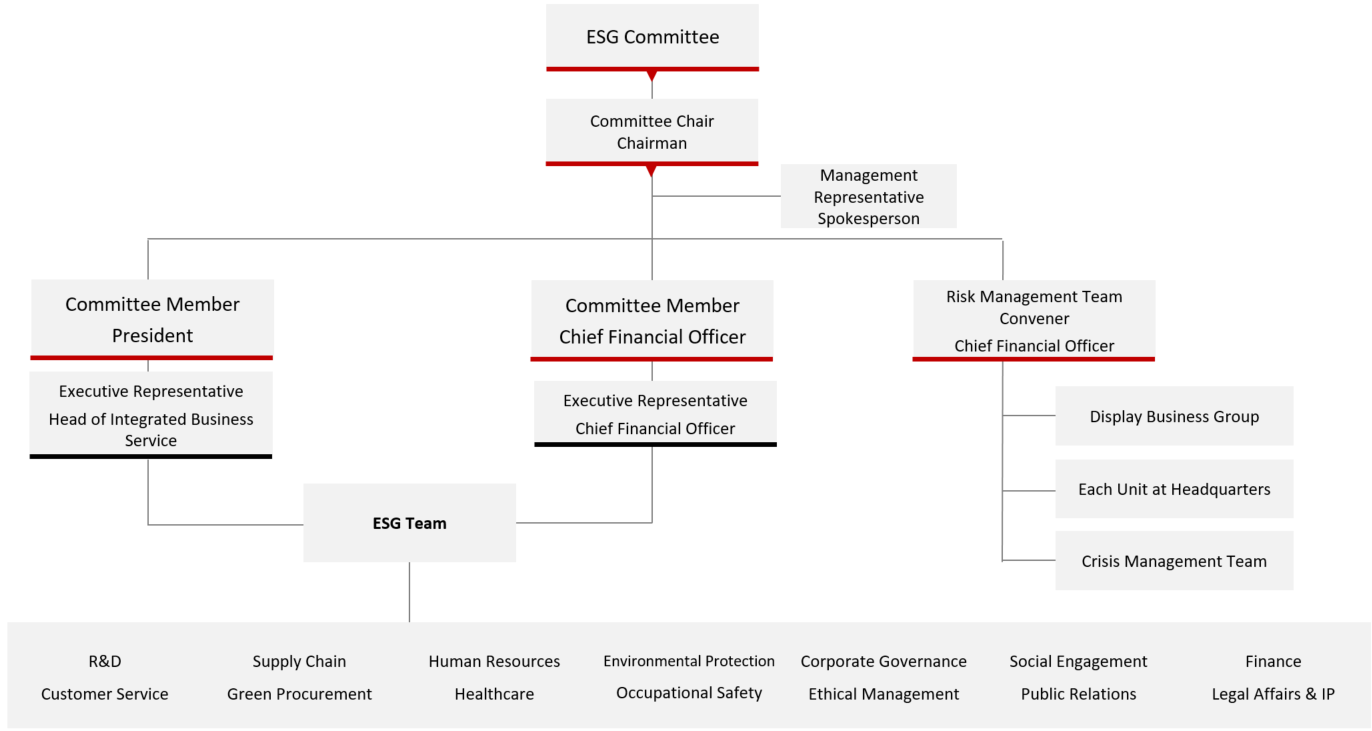 To promote sustainable development, Coretronic established the “Corporate Social Responsibility Management Committee” in 2008, which was renamed the “ESG Committee” in 2020. Following the “Sustainable Development Best Practice Principles” approved by the Board of Directors, the Chairman serves as the “Committee Chair” of the ESG committee, with the President and Chief Financial Officer (CFO) as “Members (or Commissioners)”. The “Management Representative” role is assumed by the Spokesperson. The ESG Committee also authorizes “Executive Representatives” from governance/economic, social, and environmental departments to assist in advancing ESG-related initiatives.