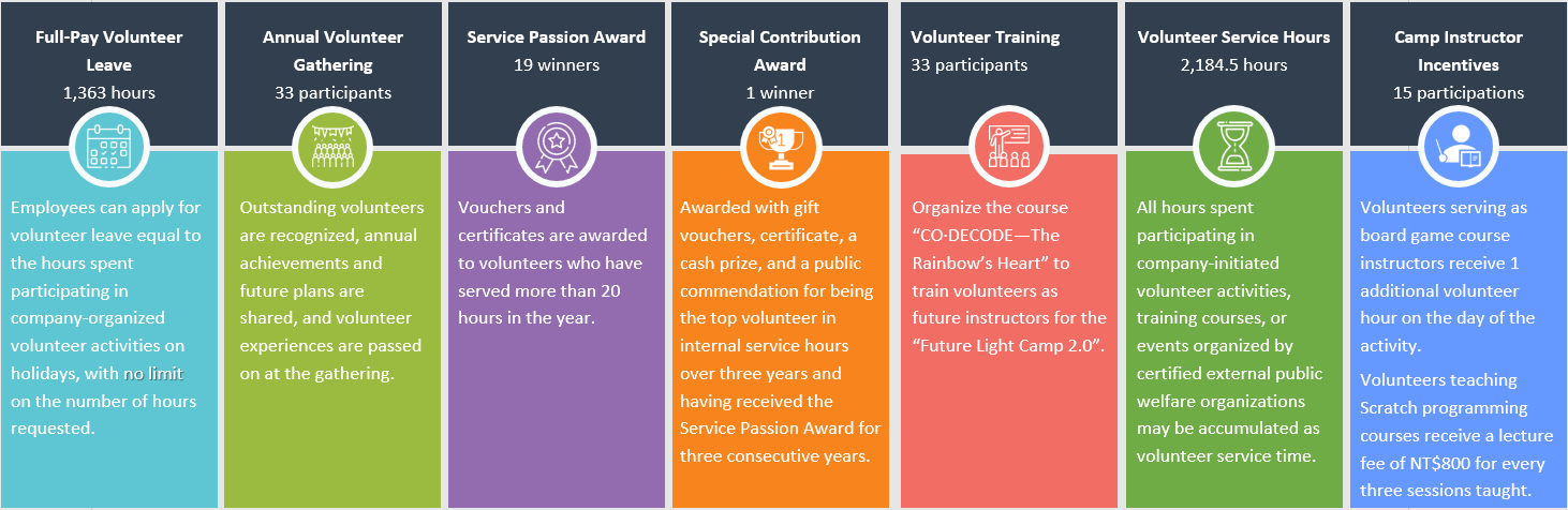 In an effort to promote and realize ESG, we established the “Firefly Volunteer Club” in 2011 but changed its name to “Firefly Volunteer Team” in 2015. In 2018, we instituted the “Management Regulations for Firefly Volunteer Team” to include paid volunteer leave during holidays, a volunteer reward system, annual volunteer assembly, annual volunteer day, and volunteer training courses. A total of 174 volunteers at Coretronic are categorized into different volunteer groups, namely “Charitable Volunteers,” “Environmental Protection Volunteers,” and “Product Volunteers,” which are in charge of charity, environmental protection, and product introduction and installation, respectively. Achievement until December 31, 2024: