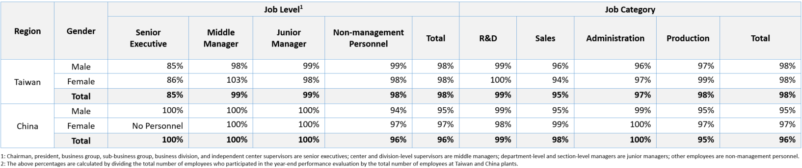 - At Taiwan plants, all employees, except those under probation, on unpaid leave, or under fixed-term contracts, are required to participate. At China plants, all employees, except those under probation, with long-term work injuries, short-term interns, or on unpaid leave, must participate. The Company adopts a performance-based approach and ensures no discrimination based on gender.