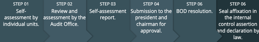 An internal audit system is planned and designed with reference to the internal control system of individual departments. Based on this internal audit system, the internal control of each process is reviewed, and the suitability of the design, practice, effectiveness, and efficiency of such control are reported. In accordance with regulatory requirements, an internal audit shall be implemented every year to review the self-assessment of the internal control system of individual departments. The scope of audit covers the internal control of the effectiveness and efficiency of operations, the reliability of financial statements, compliance with related laws and regulations, etc.; and assessment of the risk level of operations of individual departments. Based on the audit outcomes, the Audit Office will plan the audit program for the next year and implement the audit with BOD approval.