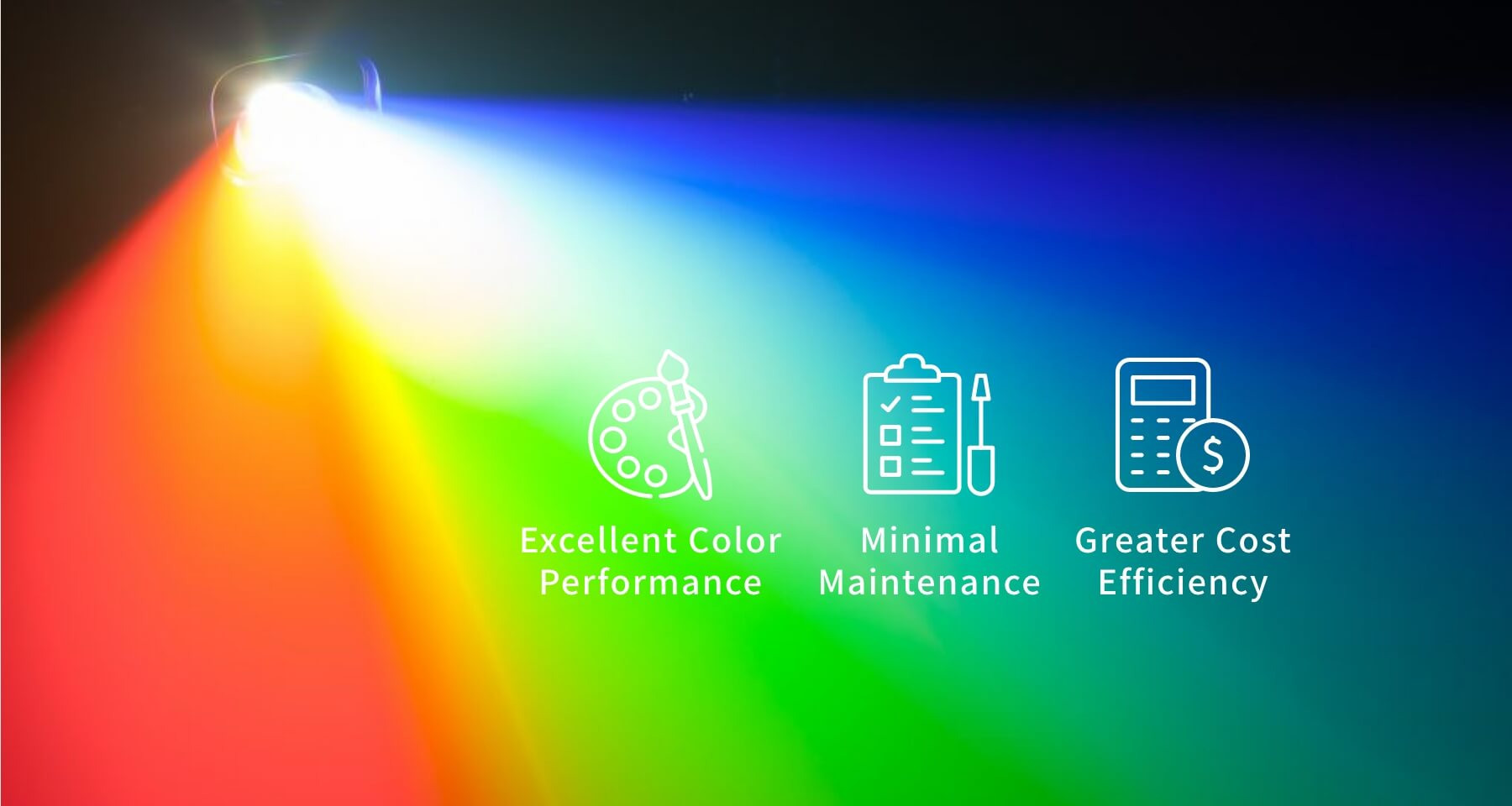 Laser phosphor technology is a future-proof and cost-effective way to make laser illumination projection affordable in more application fields. It primarily uses blue laser diodes in combination with a phosphor wheel that generates red and green colors, whereas RGB laser technology uses separate red, green, and blue lasers.