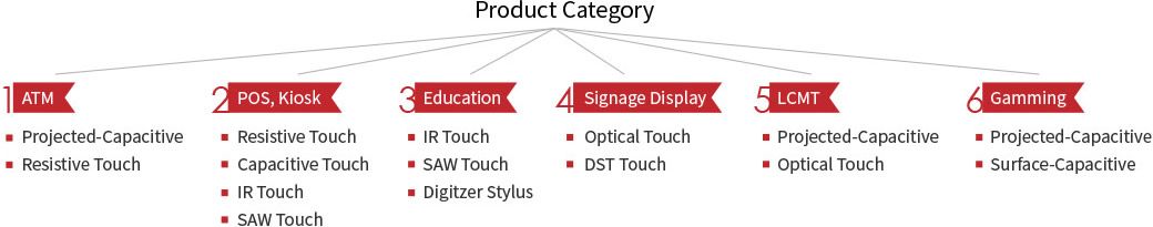 目前我們以「投射電容式」為主要發展方向,生產尺寸可達到28''。除原有生產行動電話、平板電腦、NB、AIO等產品,更積極開發下列領域:
