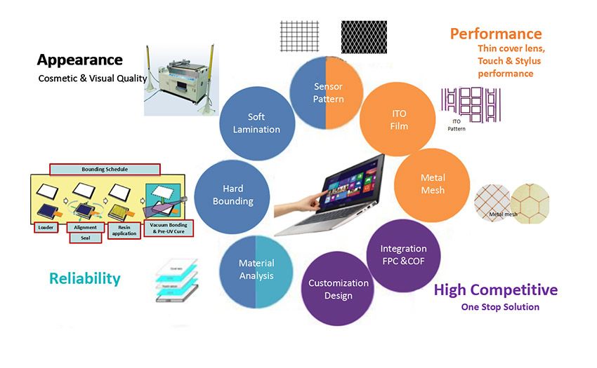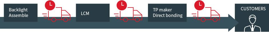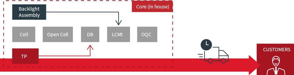 LCM/TP/BKL 整合生產,此方式不同於一般業界,能達到垂直整合方案,並提供給客戶total solution及客製化差異。