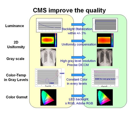在醫學影像品質方面,中光電自行開發出Color Management System,賦予顯示器更精準的影像品質,具體提升顯示器在多方面的表現:亮度穩定與精準、畫面均勻度、精確的DICOM表現、灰階色溫穩定及精確的色彩表現。
