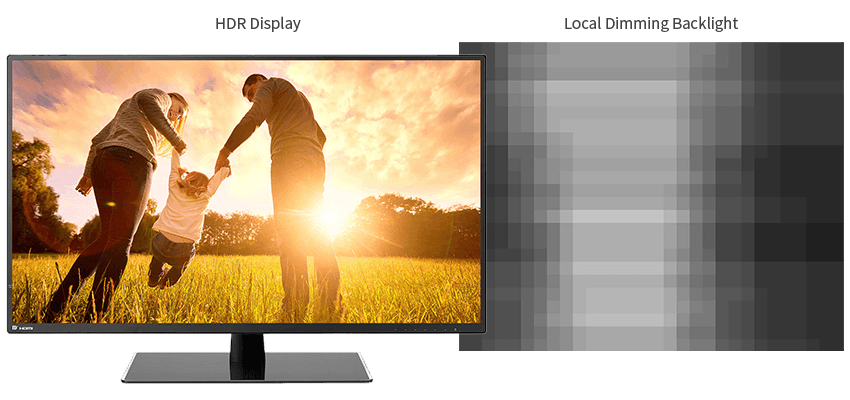 採用支援多區域動態調光的背光模組的LCD顯示器,能依據畫面的不同調整其對應區域的背光亮度,每個區域皆能達到HDR1000的高亮度,進而展現高動態對比的影像,重現宛如真實世界般的高亮度及暗部細節。