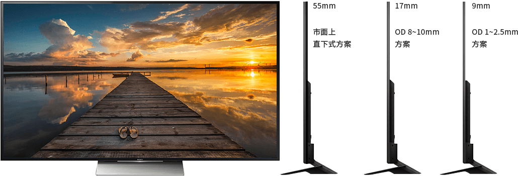 自主研發出與側入式顯示器厚度一樣薄的直下式顯示器,結合局部調光功能,可實現超薄、節能與高動態對比的特色。 藉由光學透鏡設計開發能力, 可以將混光距離(OD)從市面上約20~25mm降至8~10mm,甚至可進而達到2mm,實現超薄直下式顯示器技術。