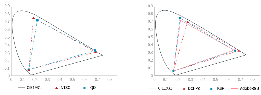 KSF LED應用:背光模組光源使用KSF LED並整合高色域液晶面板,可達成Adobe RGB 100% 色彩飽和度,並可達成HDR高動態顯示器色域規範DCI-P3大於90%需求。