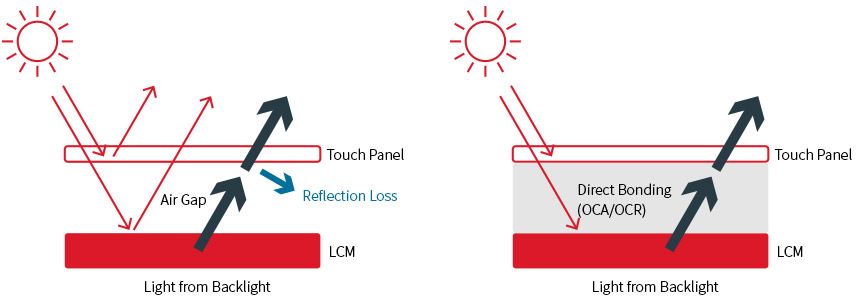 我們針對客戶不同的需求提供了OCA(固態透明光學膠)與OCR(液態透明光學膠)來進行觸控面板與顯示器的全平面貼合。光學膠貼合可以有效降低環境光線反射,增強顯示的對比度,並且達到更好的防灰塵、耐候的效果。